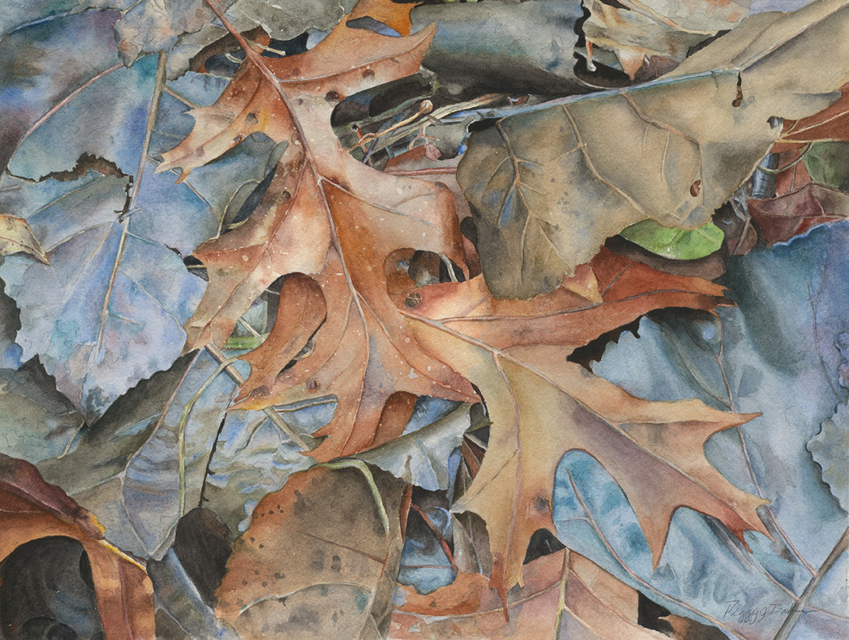 I found the inspiration for this painting in my backyard in the late fall. The leaves were wet from a recent rain and the cottonwood had a blue tint to it. It's one of my favorite paintings. I love the colors in it.