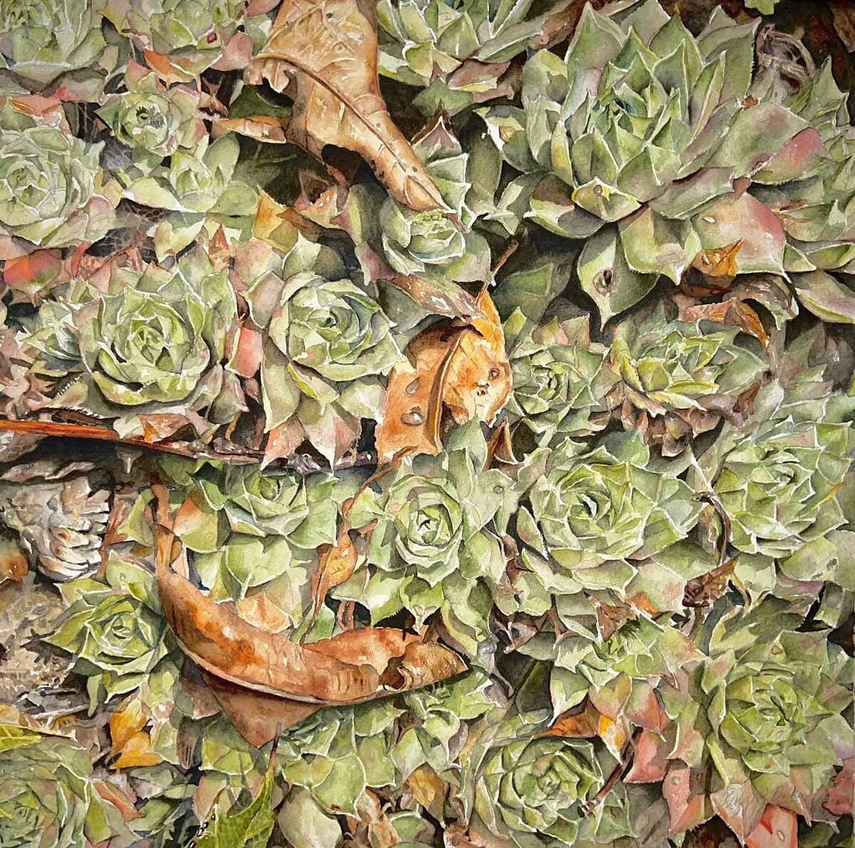 This painting came from the hen and chicks growing in our yard. The fall leaves were intertwined with the hen and chicks making an interesting composition. This painting is in the private collection of my daughter.